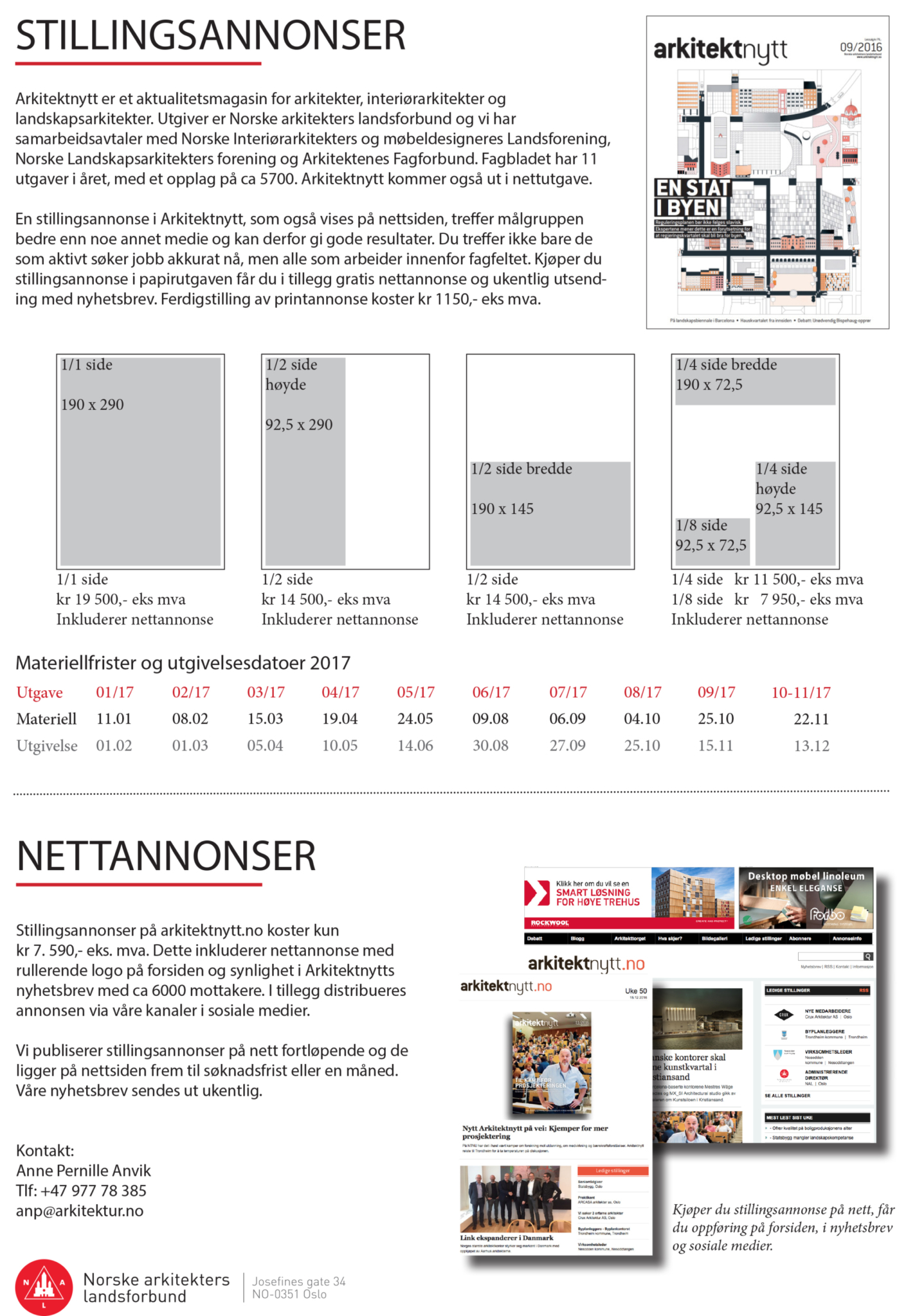 Ønsker du å annonsere i Arkitektnytt og Arkitektur N, eller på arkitektnytt.no? Her finner du priser, utgivelsesdatoer, materiellspesifikasjoner og kontaktinfo. Trykk på linkene i artikkelen under for å laste ned våre medieguider for 2017. For mer informasjon om annonser:Produktannonser: annonser@arkitektur.no Stillingsannonser: anp@arkitektur.no