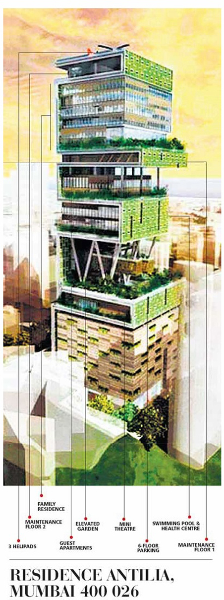 Heliopad (det moderne ord for helikopterplattform), seks etasjer med bilparkering. Og av det mer luksuriøse: et hjemmeteater, gjesteleiligheter med glass fra gulv til tak. Mer gulvplass enn i Versailles, men tross alt skal Mr. Ambani ha rom for sin mor, sin kone, tre barn og 600 tjenere i fulltids arbeid. Og ikke å forglemme de hengende hager med åpne etasjer, de gir preg av at Barcode er lagt til grunn, men det er neppe begrensninger i utnyttelsesgraden som betinger luftigheten.