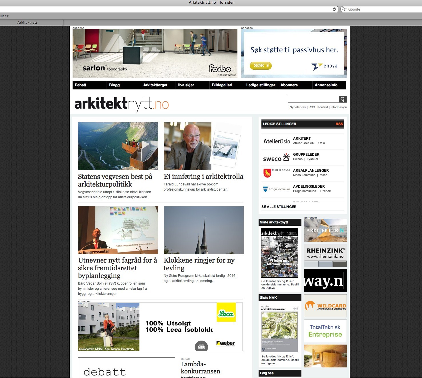 Nettutgaven arkitektnytt.no ble lansert i 2005, og relansert i 2010 med ny design og ny funksjonalitet. Gjennom å abonnere på vårt gratis nyhetsbrev kan du holde deg oppdatert arkitekturnyheter direkte i innboksen din. En annen måte å holde seg oppdatert på er ved å følge oss på Facebook, Twitter, Google+, Instagram og LinkedIn.