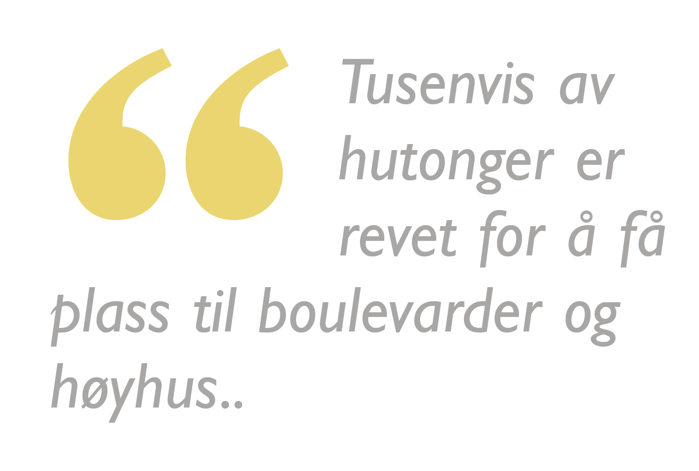 Tilbake i Beijing kjører vi med rickshaw gjennom hutong-området Xicheng. En hutong er et lavt, tradisjonelt boligområde med smale grender. Vi kommer der inn i en typisk courtyard, bebodd i fire generasjoner. Fra opprettelsen av folkerepublikken i 1949 er tusenvis av hutonger revet for å gi plass til boulevarder, høyhus, trafikkmaskiner og fancy shoppingstrøk. Både Unesco og lokale aksjonsgrupper protesterer mot denne utslettelsen av gammel boligkultur med integrerte funksjoner i hvert område. En del av dem er nå vernet, og det er håp om at de kan få innlagt vann og strøm. Slike fasiliteter har familiene fått i sine nye blokkleiligheter, men de har mistet mange sosiale kvaliteter i disse høyblokkene. Leilighetene er små, tilpasset de kinesiske ettbarnsfamiliene og uten plass til besteforeldre. Dette har skapt både praktiske og sosiale problemer for mange. Lange avstander mellom bolig, barnehage, skole og fritidsaktiviteter forsterker problemene og framtvinger behov for egen bil.