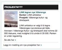 Som et eksempel har vi lagt inn prosjektnyheten om at LINK arkitektur har fått i oppdrag å tegne nye Vålerenga kultur- og idrettspark i Oslo.