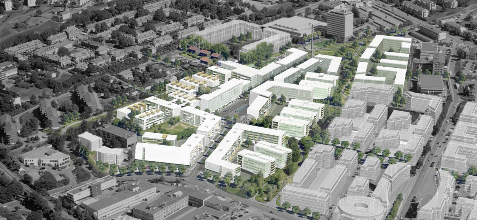 Det viser en sammensatt utbyggingsform hvor bygningsstrukturen, som åpner seg mot områdets ytterkanter, definerer ei hovedgate. Forslaget inneholder tre bebyggelsestyper – lineær bebyggelse langs hovedgata, lameller i overgangen mot parkområdene og mer sluttede kvartaler i nord.