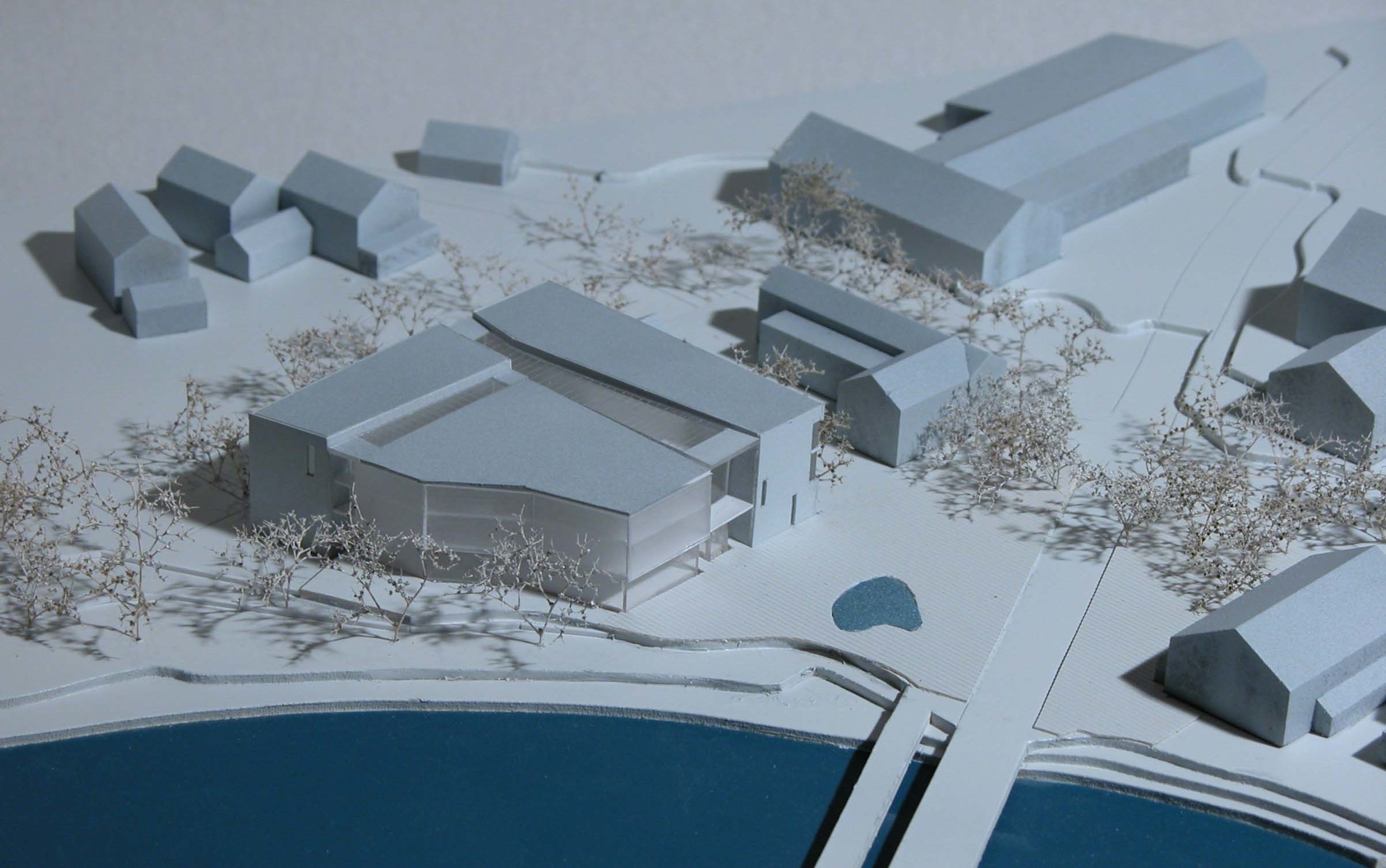 Juryen var meget godt fornøyd med plasseringen av rådhuset i L2 Arkitekters utkast, men ønsket mer stedstilpassing. I bearbeidet versjon er rådhuset blitt lavere, blant annet etter senking av golv i biblioteket mot elva, og har fått trematerialer i fasadene, slik det framgår av fasadeopprisset fra sør. Modell: Oslo Modellverksted.